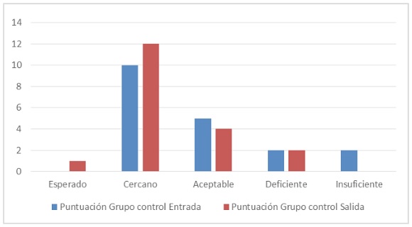 Con respecto al grupo Control, se puede evidenciar que los resultados de la prueba de salida son semejantes a los obtenidos en la prueba de entrada. Solo en una variable hubo una mejoraría equivalente a más de una unidad. Las otras once variables permanecen cercanas al valor inicial. Por otro lado, los resultados del grupo Experimental son más alentadores, puesto que once de las doce variables presentan mejorías, y seis de ellas están por encima de la nota 3,0.