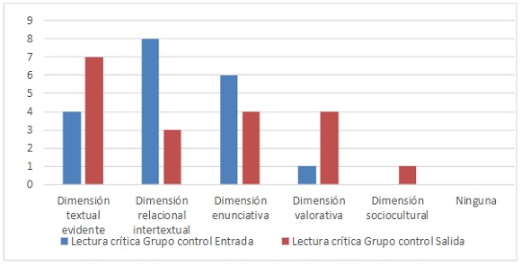 La Figura 15 señala cómo los participantes del grupo Control en la prueba de entrada obtuvieron mejores resultados en las dimensiones textual-relacional, intertextual y enunciativa, pero no evidenciaron competencias en las dimensiones valorativa y sociocultural. No obstante, en los resultados de salida, se vislumbraron algunos participantes con estas dos dimensiones. Es relevante mencionar que todas las dimensiones son necesarias para la realización de una lectura crítica y cada una complementa los procesos sociocognitivos (van Dijk, 1999) requeridos por las otras.