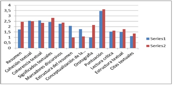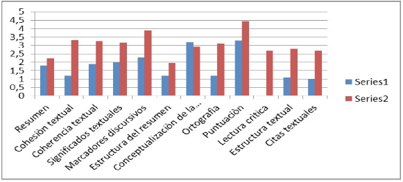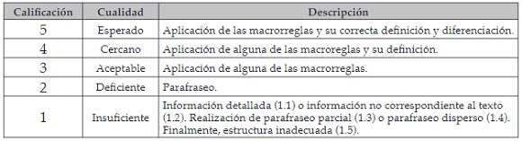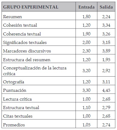 Los participantes, tanto del grupo Experimental como del Control llegan con un desconocimiento general de las macrorreglas; solo un participante del grupo Control aplica algunas de ellas y las define, mientras que en el grupo experimental continúa manifestándose el desconocimiento general; con respecto al caso de la aplicación de algunas de las macrorreglas, pero sin explicación de las mismas, el grupo Control presenta cuatro estudiantes, mientras el Experimental siete. En lo correspondiente a la deficiencia, en tanto hay una redacción restringida al parafraseo, el grupo Experimental cuenta con dos estudiantes y el grupo Control con uno; por último, son siete estudiantes del grupo Experimental y trece del Control que llegan con insuficiencia total en el uso del resumen. No obstante, es visible que los resultados obtenidos por los participantes del grupo Control son ligeramente, en términos cuantitativos, más restringidos que los del Experimental para esta variable (1,73 vs 1,80).